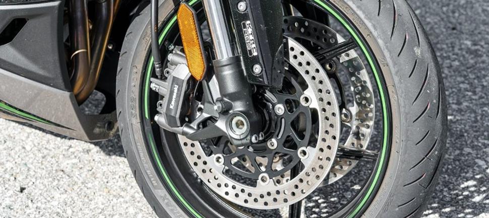 Вся эта плавная, легко доступная тяга запросто приводит к тому, что набираешь слишком большую скорость. К счастью, тормоза у Ninja под стать двигателю: радиальный мастер-цилиндр приводит радиальные же суппорта при содействии модуля KIBS (ABS, иначе говоря) - и всё это обеспечивает точное и мощное тормозное усилие. Если, конечно, не вмешивается KIBS, работающая в сцепке с устройством измерения инерции для отслеживания угла наклона.