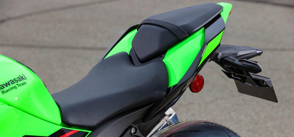 Эргономика ZX-10R 2021 также поменялась. Ветровое стекло стало на 40мм выше и установлено под более крутым углом, увеличивая размер “силового поля”, за которым райдер прячется от набегающего потока. Клипоны выдвинуты на 10мм вперёд и расположены более прямо. Подножки перенесли выше на 5мм, и выше также стала задняя часть сиденья. Всё это обуславливает более агрессивную спортивную посадку.