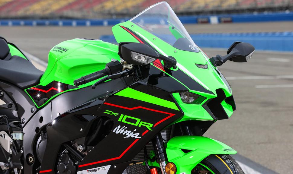 Но как бы мы с вами ни относились к дизайну Kawasaki ZX-10R, одно в нём осталось неизменным - приоритет содержания над формой. Обновлённая форма переднего обтекателя обеспечивает уменьшение лобового сопротивления на 7%, а прижимная сила от встроенных в пластик крылышек увеличилась на 17%. И я готов хвалить команду конструкторов с тем же рвением, с каким глумлюсь над дизайном - в особенности за то, как удачно они научились встраивать в пластик аэродинамические крылья вместо того, чтобы просто оставлять их торчать по бокам переднего обтекателя.