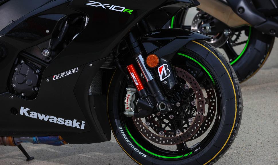 И без ABS радиальный цилиндр Brembo с суппортами M50 на 330-миллиметровых дисках обеспечивают великолепное тормозное усилие. Единственный минус - в резиновых тормозных шлангах: ватность ручки ощущается буквально сразу. Казалось бы, чего стоит поставить на топовый спортбайк армированные? Дешёвый трюк для того, чтобы склонить к выбору RR, не думаете? Обойдётся это в копеечку: ZX-10RR стоит около $29000, а с одной R мотоцикл начинается с $16500 за версию без ABS, и с $17700 за KRT Edition с ABS.
