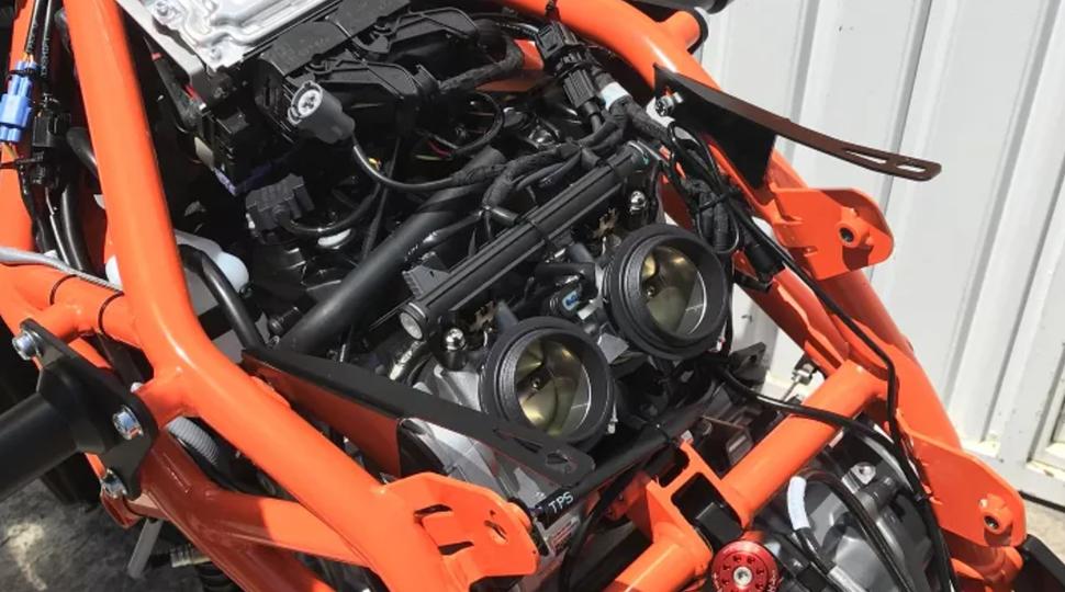 Но главная достопримечательность KTM RC 8C - это 889-кубовый двигатель с широченной полкой момента и пиком в 97,6Нм на 8250об/мин, напрочь лишённый излишних вибраций на любых оборотах, несмотря на утрату одного из балансирных валов в погоне за снижением инерции. Это, в сочетании с гораздо более лёгким коленвалом новейшей версии RC 8C, придаёт мотору бодрый крутильный характер, и наверху ему добавили 1500 оборотов до отсечки. Так что вместо переключения на 10500об/мин, как у первого поколения этого мотоцикла, можно (верней, нужно) крутить его выше. На 11000об/мин его мощность составляет 135лс, и тут начинает дико мигать подсказка "пора переключиться" на TFT-панели, чтоб вы не забыли воткнуть следующую передачу. Порядок передач за пару минут можно поменять с дорожного на трековый и обратно.