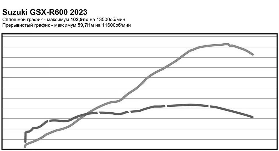 Именно в нём мотоцикл и испытывался на диностенде, где Suzuki GSX-R600 2023 года произвёл пиковые 102,9лс на 13500об/мин и 59,7Нм на 11600об/мин. При весе в 190кг Suzuki имеет примерно то же соотношение мощности к массе, что и главный соперник, Kawasaki Ninja ZX-6R, выдающий 108,4лс при массе 196кг. 599-кубовая рядная четвёрка Suzuki имеет линейную кривую мощности с уверенным и чётким откликом на любых оборотах. Типично слабые для этой компоновки низы требуют от райдера большего контроля над оборотами, чем у конкурентов, но устойчивое шасси компенсирует этот недостаток в поворотах.
