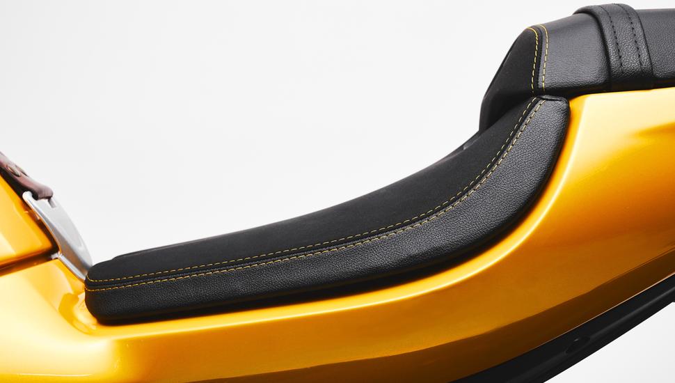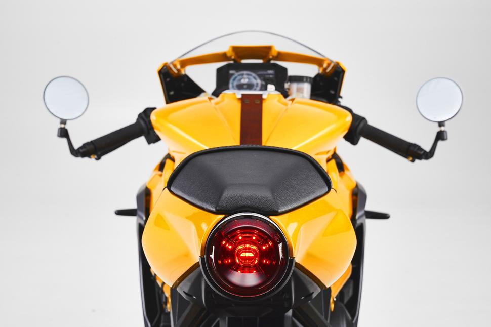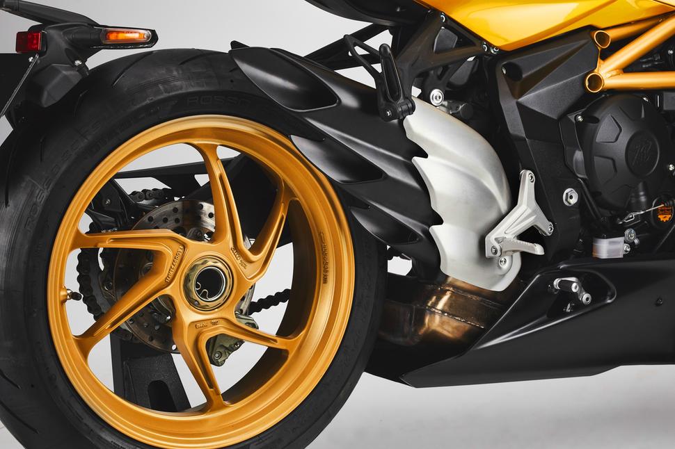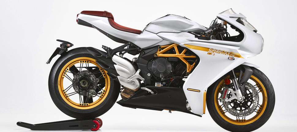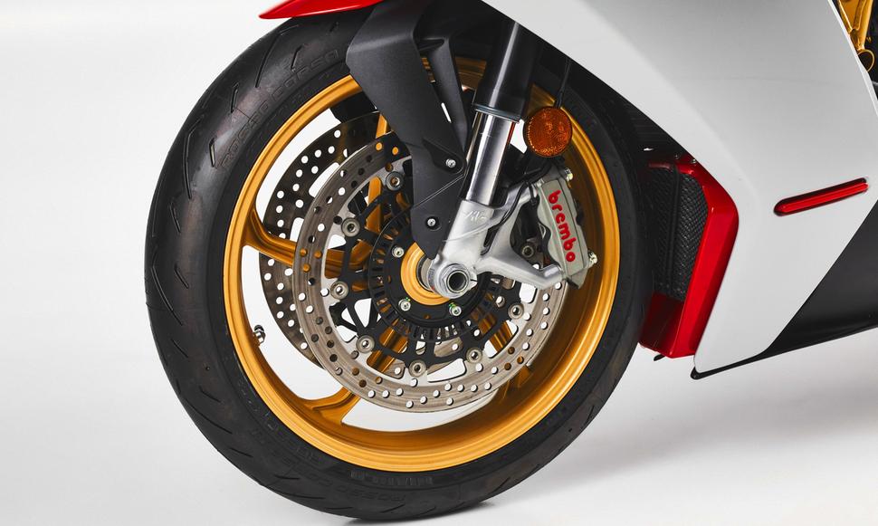 Помимо Superveloce стандартной комплектации, MV Agusta предлагает на 2021 год вариант S в бело-золотой ливрее с коричневым сиденьем, обшитым Алькантарой и на бескамерных спицованных колёсах.