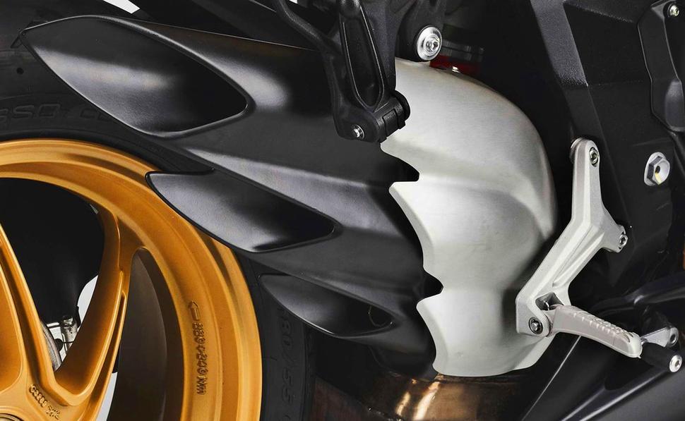 На тесте - жёлто-серый вариант, который, к сожалению, на фоне официальных снимков выглядит тускло, и золотая рама это только подчёркивает. Что ж, Италия - это мировой центр фэшн-индустрии, и тамошние фотографы кого и что угодно способны подать в наиболее выгодном свете. Несколько портит картину и новый выхлоп под Euro 5 - такой же угловатый, как на других 800-х тройках 2021 года. Нельзя сказать, что он совсем некрасив, но на гладкой и элегантно-классической Superveloce он выглядит как киберимплант на тургеневской девушке. Любители такого дела найдутся, но это точно не для каждого. Причём гоночный комплект для Superveloce S включает выхлопной тракт Arrow, намного более изящный и подходящий характеру Superveloce, правда, по всей видимости, не соответствующий Euro 5.