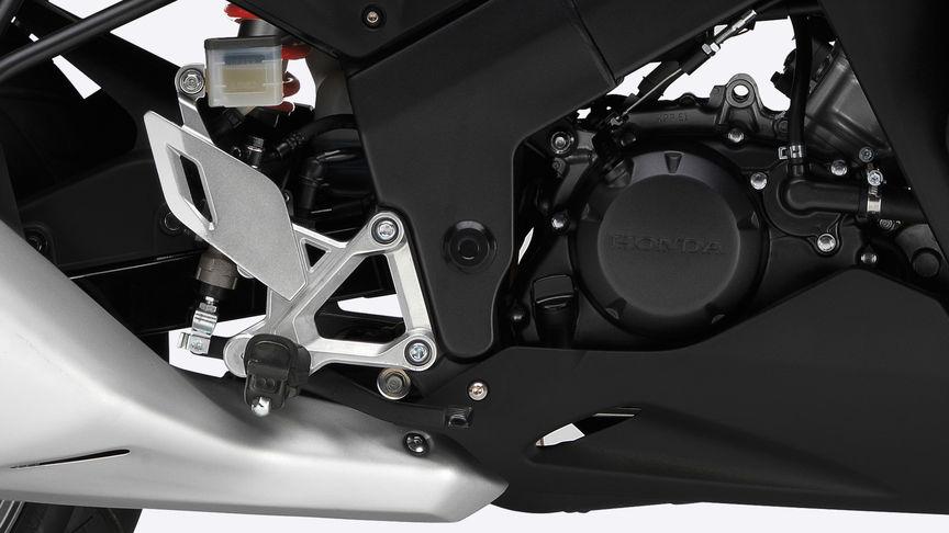 Ниже фары головного света обтекатель переходит в типичную для спортбайков чашевидную капотировку - аэродинамический вентилируемый кожух, отводящий с боков мотоцикла излишки тепла. В его небольшие вырезы проглядывает двигатель и части лонжеронной рамы, но всё остальное скрыто пластиком. Складные подножки, установленные на подрамнике вместе с задними ручками и приподнятым задним сиденьем создают пассажирский набор комфорта, каким бы минимальным он ни был. Но это и неудивительно: Honda CBR125R - это совсем не тот класс мотоцикла, от которого стоит ждать комфорта пассажира.