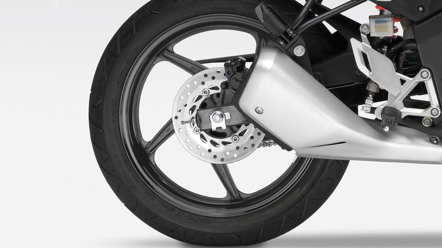 Тормозная система Honda CBR125R состоит из одного 276-миллиметрового диска спереди, на котором установлен двухпоршневой суппорт, и однопоршневого суппорта с 220-мм диском сзади, оба - без ABS или какой-либо технологии комбинированных тормозов. Это, разумеется, влияет на безопасность, но не забываем, что это учебная модель, позволяющая новичкам прочувствовать обратную связь тормозной системы и выработать навык езды без электронных прибамбасов. Впоследствии желающие смогут успешно утратить приобретённые навыки на более оснащённых аппаратах.