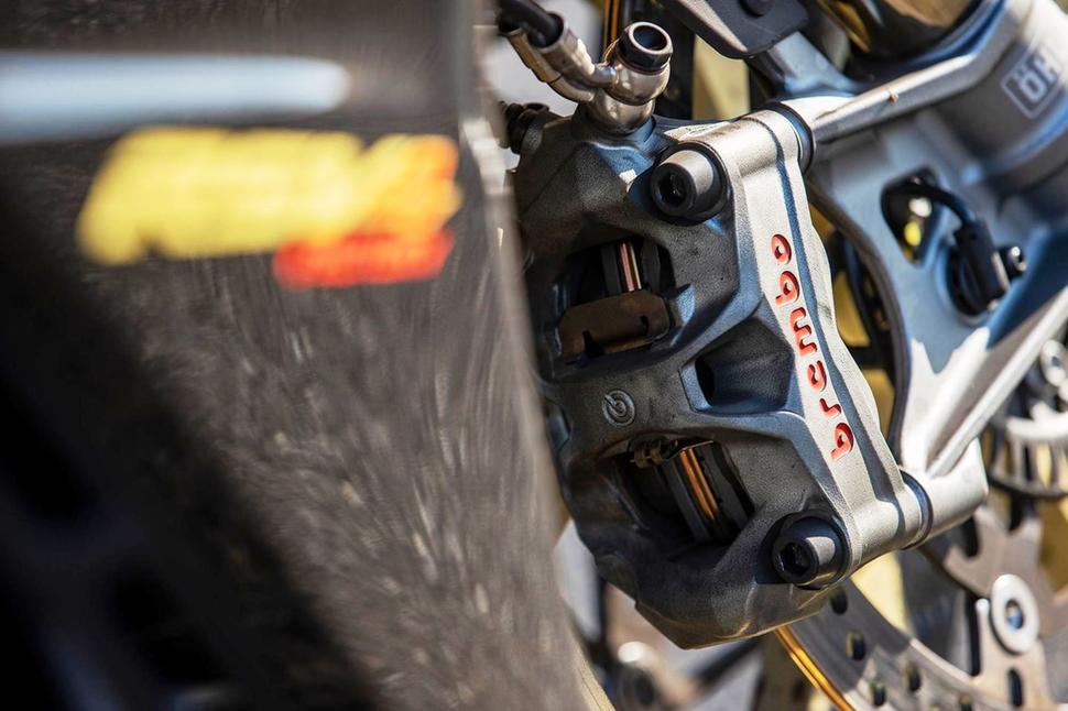 Но быстрого ускорения Ducati мало, нужно учитывать ещё и тормоза! Первоклассные суппорта Brembo Stylema R на SP2 (плюс штатный выносной регулятор ручки тормоза у левой грипсы) дают не просто великолепное тормозное усилие, но и высочайшую информативность, и на фоне собранного шасси позволяют входить в повороты на невероятных скоростях с полной уверенностью. Но это требует сил, и весьма немалых! Ducati утверждают, что изменили плавную кривизну бензобака для улучшения поддержки нижней части тела, но тестеры заметили, что резкое замедление создаёт ощутимую нагрузку на руки и запястья. Добавьте к этому более высокие скорости и перегрузки на ускорениях и торможениях, и поймёте, что SP2 нуждается в выносливом райдере, который держит себя в форме.
