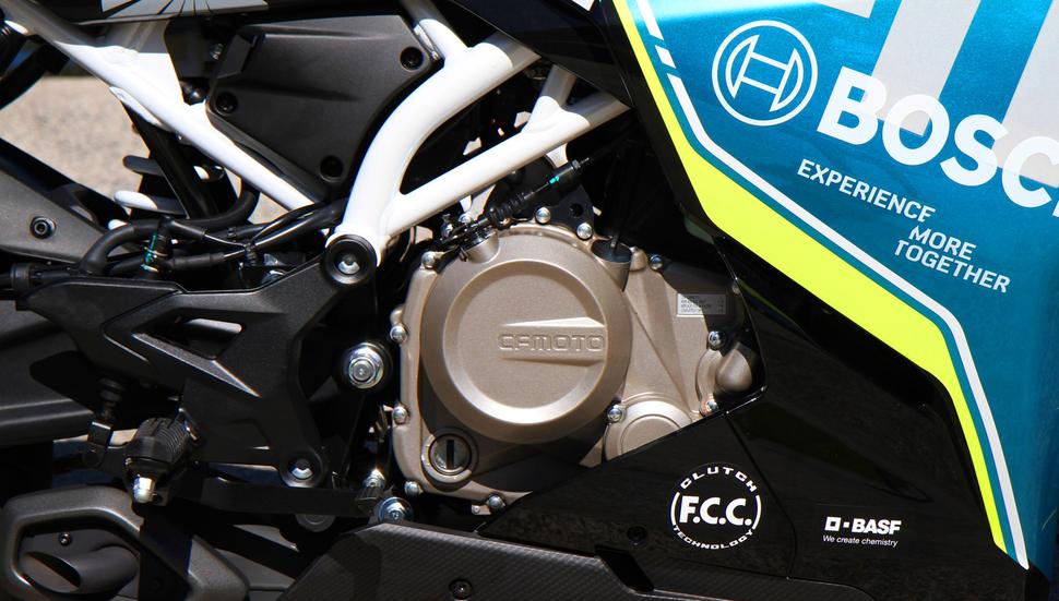 Главную проблему одноцилиндровых моторов, вибрации, здесь обуздали при помощи балансирного вала. ЭБУ от Bosch вместе с тщательно продуманной конструкцией впускного манифольда и камеры сгорания обеспечивают оптимальное сжигание топлива, повышая энергоэффективность и снижая выбросы. Симпатичный выхлоп в MotoGP-шном стиле, не увеличивающий габариты мотоцикла, выдаёт довольно внушительный звук - немудрено при одноцилиндровой компоновке. Шестиступенчатая коробка работает в комбинации с традиционным сцеплением в масляной ванне с тросовым приводом.