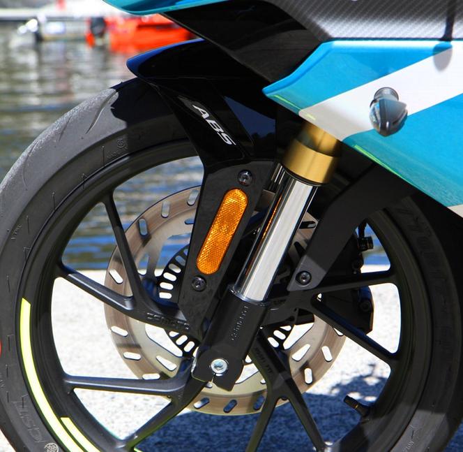 Четырёхпоршневой тормозной суппорт спереди и однопоршневой сзади - от испанцев J.Juan. Легкосплавные колёса в дорожных шинах вносят свой вклад в общий малый вес мотоцикла - 165кг в снаряжённом виде.
