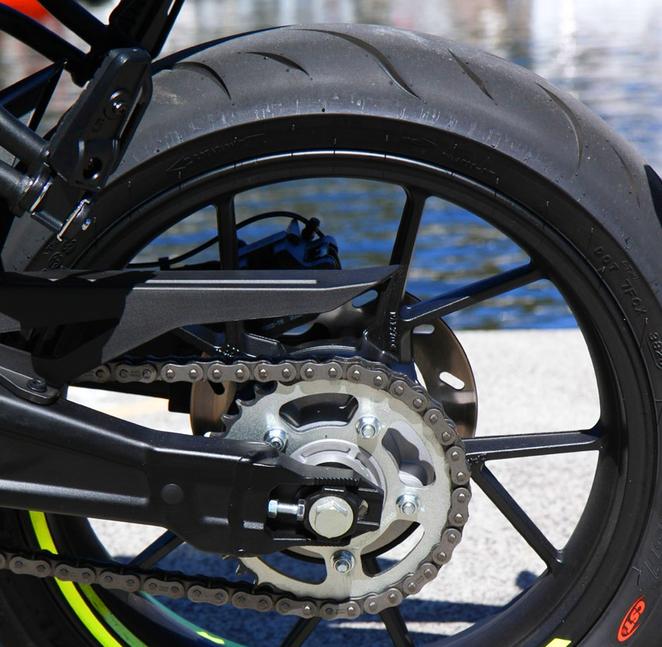 Штатная резина довольно легко прогревается и показывает себя цепкой и надёжной, подстрекая к более быстрому проходу поворотов и беззаботном использовании юркости лёгкого малыша. Тормоза (с ABS от Continental) действительно притёрлись и стали довольно уверенно хватать при начальном выжиме и вполне пристойно останавливать мотоцикл, но им всё же чуть не хватает обратной связи.