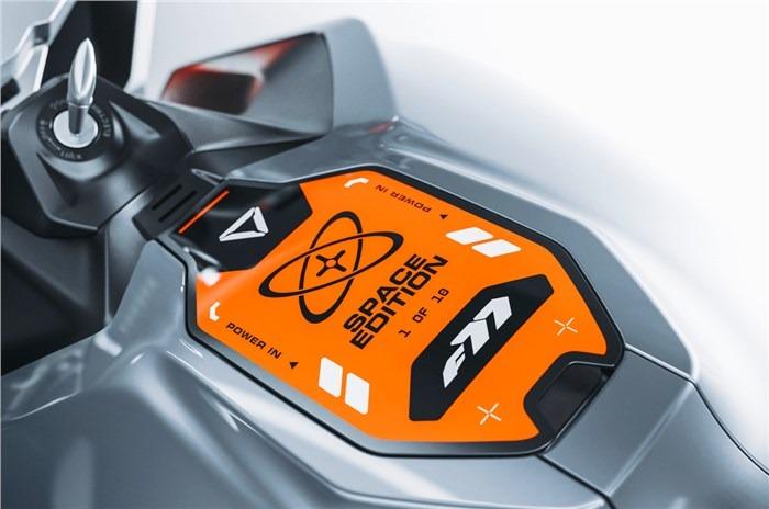 По словам Ultraviolette, они использовали в F77 Space Edition авиационные материалы, среди которых алюминиевый сплав 7075 для корпуса мотоцикла и специальная краска с УФ-защитой (что забавно в свете названия компании-производителя). Кроме того, космическая спецверсия электроцикла запускается с алюминиевого ключа. Что касается высокотехнологичных решений, то Ultraviolette F77 Space Edition оборудован системой быстрой зарядки, пятидюймовым TFT-дисплеем, несколькими режимами езды, беспроводным интерфейсом Wi-Fi, сопряжением со смартфоном и даже штатной навигацией.
