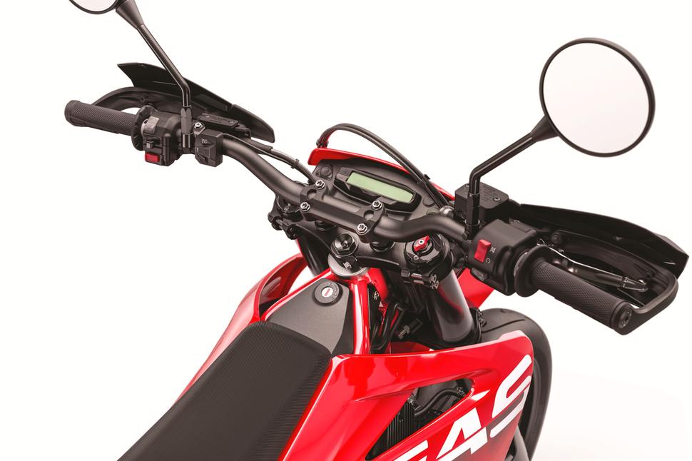 Ярко-красная облицовка с броской графикой не оставит никого равнодушным. Пластик SM 700 основан на внедорожных моделях GasGas и обладает всеми их эргономическими преимуществами. Все панели облицовки плотно облегают раму и мотор, обеспечивая наилучшую связь райдера с мотоциклом для полного контроля в любых ситуациях.
