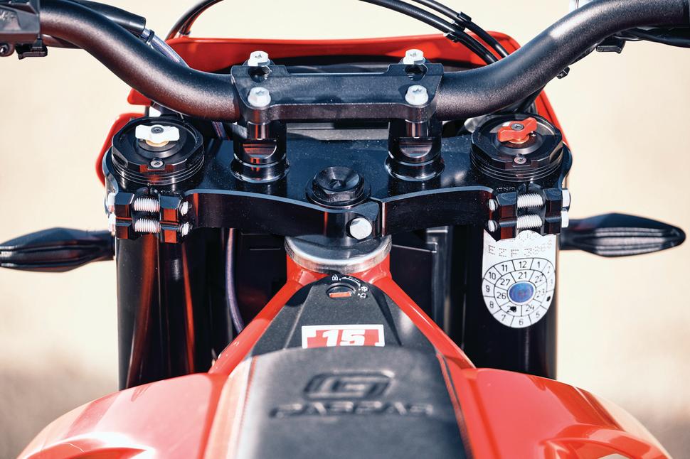 Возможность чувствовать рельеф через грипсы руля очень важна, и траверсы GasGas SM 700 разработаны именно исходя из этого. Фрезерованные на ЧПУ траверсы обладают ровно необходимым объёмом гибкости для хорошей информативности езды, а прорезиненные проставки руля обеспечат комфорт благодаря снижению вибраций.