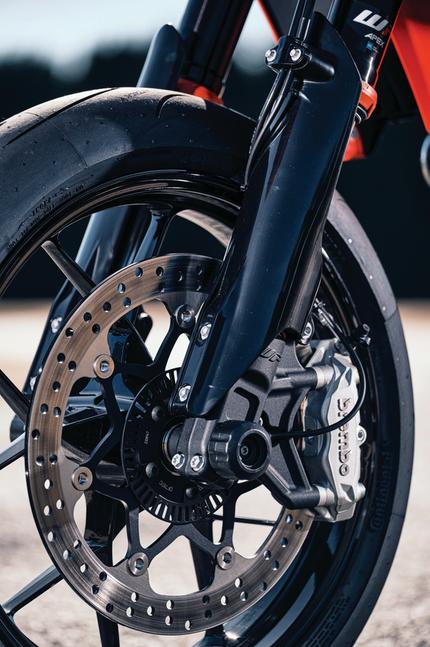 Для максимального веселья на дорогах GasGas SM 700 оснащён высококачественными компонентами и передовыми электронными ассистентами. Так, 17-дюймовые чёрные колёса не только очень здорово выглядят, но и чрезвычайно лёгкие, что вносит свою лепту в отличную управляемость. Четырёхпоршневой фрезерованный моноблочный тормозной суппорт Brembo на 320-м плавающем диске и более простой задний суппорт на 240-м диске обеспечивают великолепное тормозное усилие, контроль над которым обеспечивает двухканальная ABS от Bosch. Чёрное седло SM 700 - один из самых важных компонентов как по части стиля, так и по части комфорта и функциональности. Оно обладает эргономичным дизайном, обшито противоскользящим материалом и имеет оптимальную форму для хорошего удержания при ускорениях. Кроме того, оно износостойкое и водонепроницаемое.