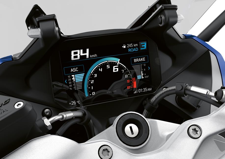 TFT-дисплей приборной панели получил Спортивный режим, в котором отображается информация о вмешательстве электронных ассистентов и углах наклона мотоцикла.