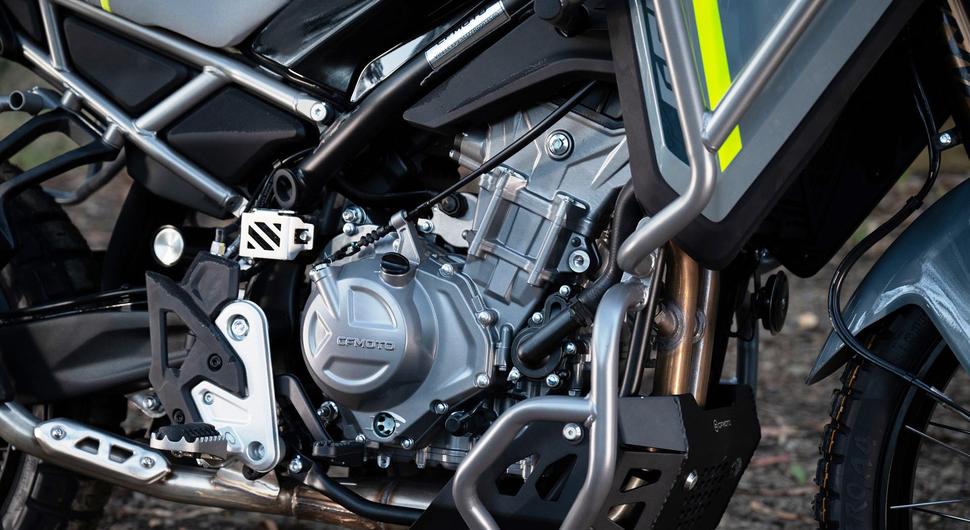 Но у CFMoto 450MT нет ни одной из этих негативных сторон. Он кажется таким лёгким, что даже паспортный вес кажется ошибочным, и он настолько хорошо сбалансирован в статичном положении, что его легко принять за прогулочный эндуро. Правда, есть некоторые отличия в поведении: если эндуро обычно тяговиты на низах, чтобы красться по грязи и камням, при этом отклик у них довольно сглаженный, то 450MT в начале хода газа оказался чересчур агрессивным. Наверняка это какой-то глюк, да и в любом случае решаемо на уровне прошивки ЭБУ, так что остаётся только ждать обещанного обновления по воздуху. В остальном рядная двойка работает мягко, а 270-градусный коленвал создаёт приятный характер тяги и отличный для штатного выхлопа звук. Двигатель весьма бодр при прощёлкивании передач вверх, а на понижении передач удобно замедляется за счёт торможения двигателем. Коробка чёткая, сцепление плавное и мягкое, с функцией проскальзывания на отщёлкивании вниз.