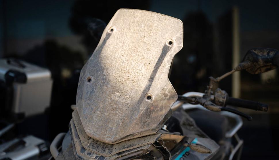 От этого турбулентные завихрения возникают прямо перед визором и весьма неслабо трясут шлем на больших скоростях, даже несмотря на верхнее положение ветровика. Возможно, в этом ещё виноват козырёк адвенчерного шлема - он справляется с прямым набегающим потоком, но завихрения передаёт на голову очень хорошо.