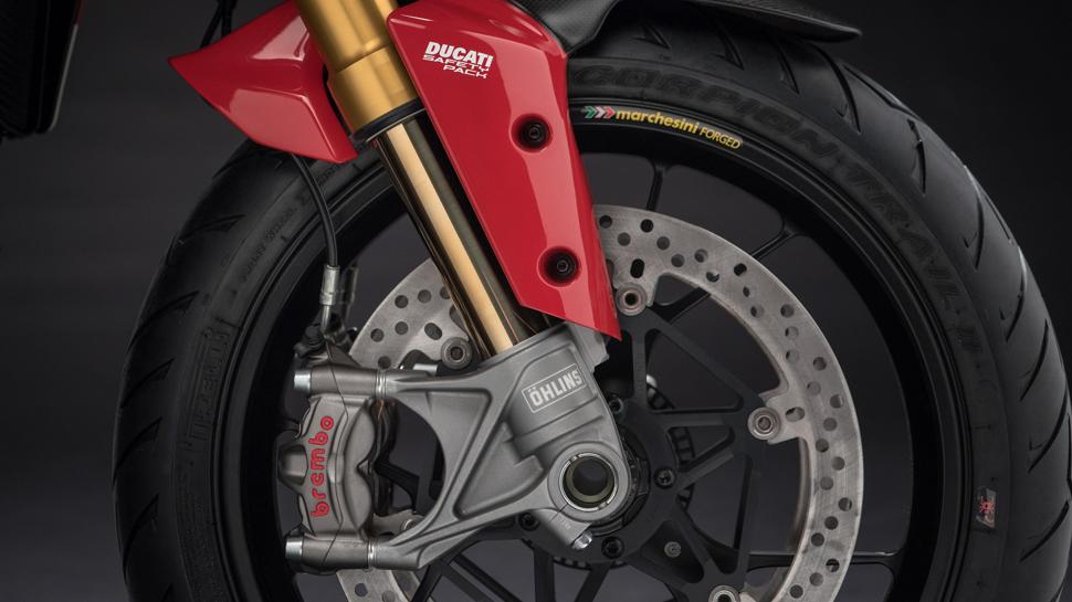Мотоцикл Ducati Multistrada 1260 Pikes Peak имеет полностью регулируемую подвеску Öhlins – перевернутая вилка спереди и моно-амортизатор TTX36 сзади, который работает в паре с алюминиевым односторонним маятником. Два кованных 17-дюймовых колеса с Y-образными спицами уменьшают аэродинамическое сопротивление и снижают неподрессоренные массы, которые способствуют гироскопическим силам, возникающим во время движения. Колеса обуты в резину Pirelli’s Scorpion Trail II размером 120/70 спереди и 190/55 сзади.