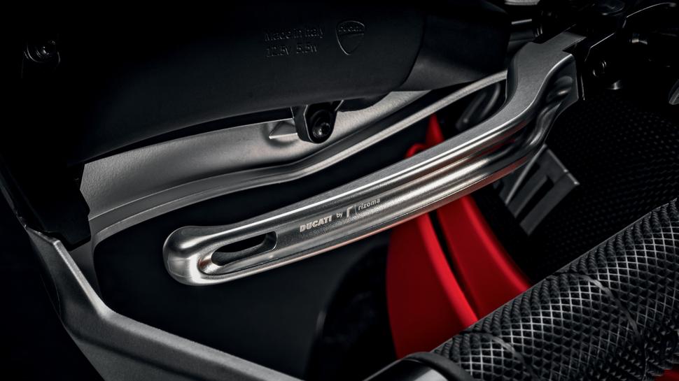Информация отображается на обновленном пятидюймовом TFT-экране, а Ducati Multimedia System через Bluetooth подключится к вашему смартфону, чтоб вы могли общаться по телефону и слушать музыку, не отвлекаясь от управления мотоциклом. Седло в серых тонах с красной прострочкой имеет два варианта установки по высоте – 825 мм и 845 мм.