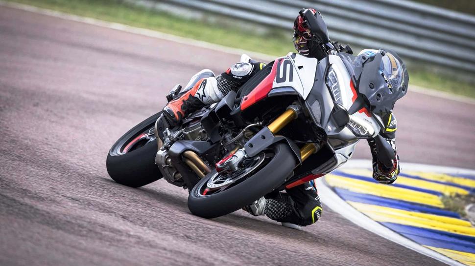 Премиальная Multistrada V4 S и новый вариант Grand Tour оснащены знакомыми полуактивными подвесками Marzocchi, а вот новая Multistrada RS, подобно Panigale V4 S, Streetfighter V4 S и Pikes Peak, оборудована Ohlins Smart EC 2.0. В каждом режиме езды задаются свои параметры сглаживания подвесок. Для первого знакомства был выставлен режим Sport, в котором великолепные электронные ассистенты поддерживают чуть больше. Но после нескольких кругов на цепких сликах стало ясно, что подвески мягковаты, вес при ускорении-торможении переносится чересчур ощутимо, а подножки (и слайдеры на ботах) слишком уж легко касаются трека.