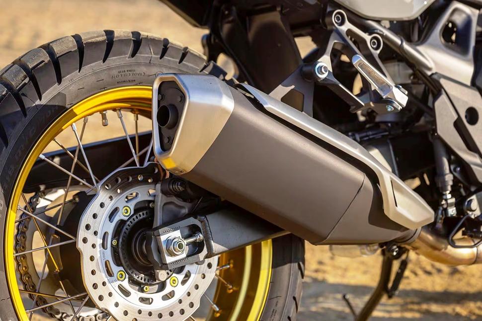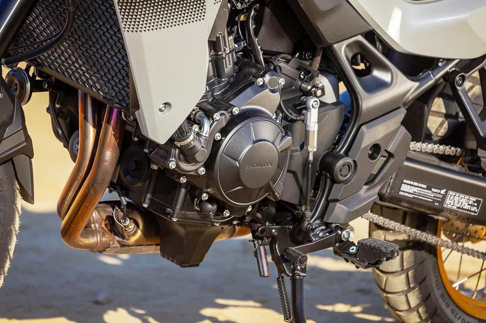 Как и большинство соперников, новая итерация среднекубатурного адвенчера Honda получила рядную двойку. Почему? Менее сложная конструкция означает уменьшение стоимости разработки и производства, снижение выбросов, а также тяговитость на низах и средних оборотах, удобную как на асфальте, так и на грунте. Конкретно Transalp оснащён тем же мотором, что и CB750 Hornet - 755-кубовой рядной двойкой жидкостного охлаждения с одним верхним распредвалом Unicam, четырьмя клапанами на цилиндр, 270-градусным коленвалом, имитирующим импульсы V-твина и впрысковой системой питания PGM-FI. Выхлоп на Transalp не только симпатично выглядит, но и вносит свой вклад в высокий клиренс для внедорожных поездок.