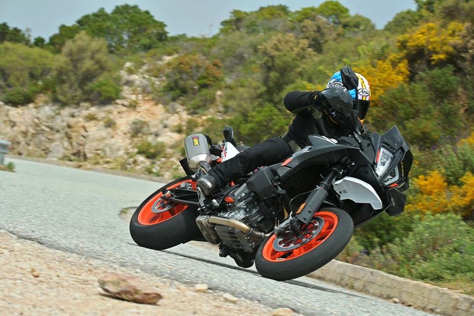 Пресс-релиз KTM 890 SMT прошёл на Сардинии - живописном итальянском острове с бесконечными серпантинами, идеально годными для KTM. Обладая мгновенным откликом на газ, он отлично едет уже с 2000об/мин, набирая злобу по мере роста оборотов. Двигатель не самый кубатурный, но на удивление бодрый. KTM 890 SMT будто телепортируется от выхода из поворота до следующей точки торможения, обожает быстрые переключения в районе 8000 при помощи чёткого (хоть и опционального) квикшифтера и очень охотно раскручивается до максимальных 10000.