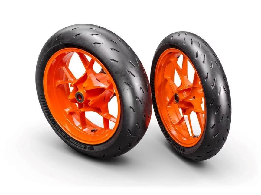 Мотоцикл оснащён 17-ми колёсами и радиальными суппортами с маркировкой KTM на 320-х дисках и наклонной ABS от Bosch. Специальный режим ABS - Supermoto - допускает блокировку заднего колеса, сохраняя ABS на переднем колесе.
