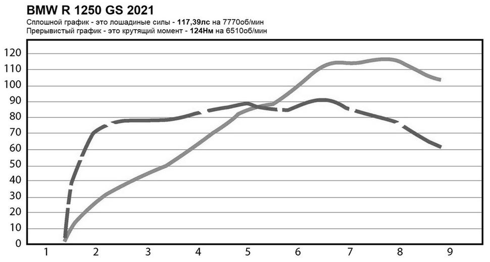 На диностенде BMW R 1250 GS 2021 года выдал пик в 117,39лс на 7770об/мин и 124Нм тяги на 6510об/мин. При этом уже с 2000об/мин доступны более 100Нм, а следом идёт широкая полка момента, делающая этот мотоцикл чрезвычайно удобным в управлении как на асфальте, так и на бездорожье.