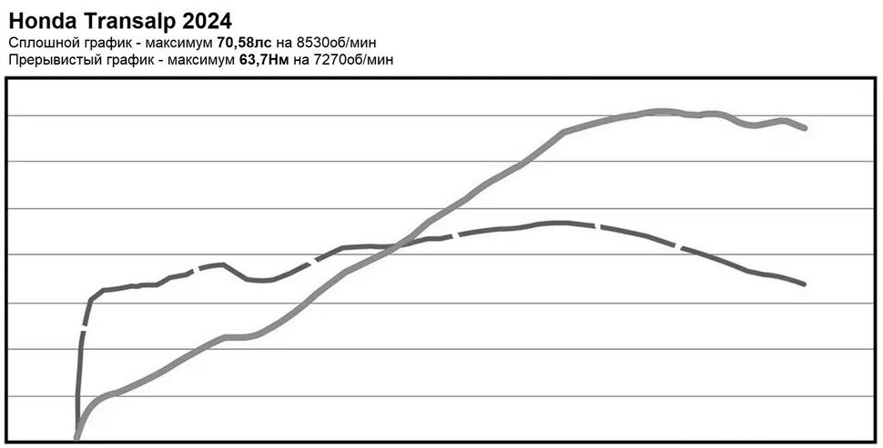 На диностенде Honda Transalp 2024 года показала пиковые 70,58лс на 8530об/мин и 63,7Нм на 7270об/мин. Для сравнения, Suzuki V-Strom 800DE 2023 года выдал на том же стенде 72,21лс и 68Нм, а Yamaha Tenere 700 2023 года там же показала 61,68лс и 57,5Нм. У Transalp имеется выраженный провал мощности и тяги в районе 3500об/мин, но на верхах двигатель выдаёт практически полную пиковую мощность вплоть до отсечки на 10000об/мин. Мотор Honda не так тяговит, как у Suzuki, зато имеет заводной верховой характер и позволяет использовать весь диапазон оборотов.