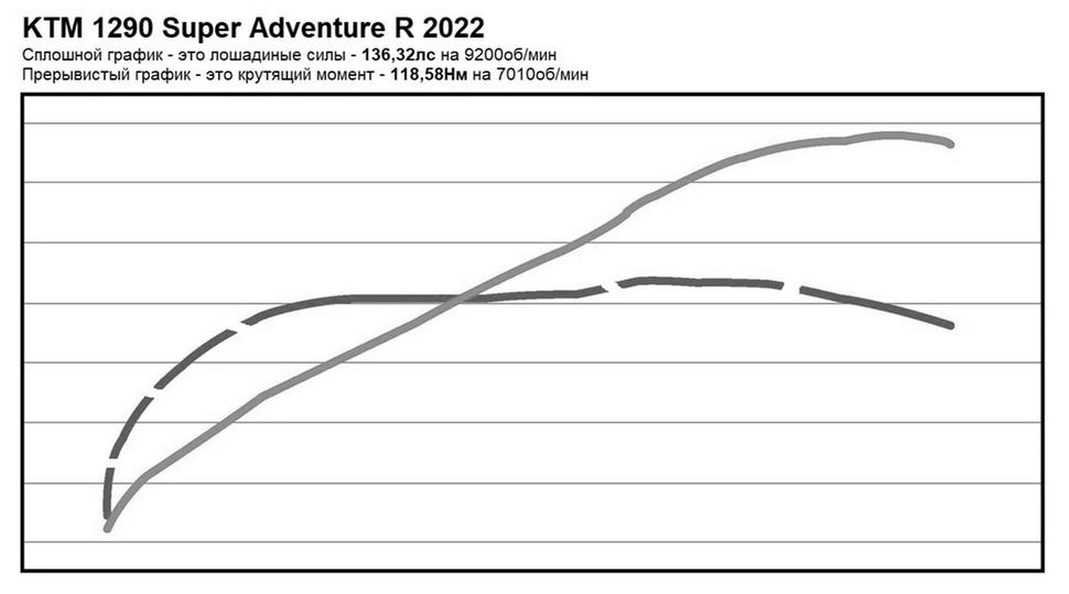 На диностенде KTM 1290 Super Adventure R 2022 показал пик в 136,32лс на 9200об/мин и 118,58Нм на 7010об/мин. Отдельно стоит отметить, что уже с холостых крутящий момент принимает весьма внушительные значения, а с 3500об/мин выходит на ровную полку свыше 108Нм, которая слегка проседает только после 9000об/мин. Интересно, что на Super Duke R Evo аналогичный двигатель определённо имеет другие настройки.