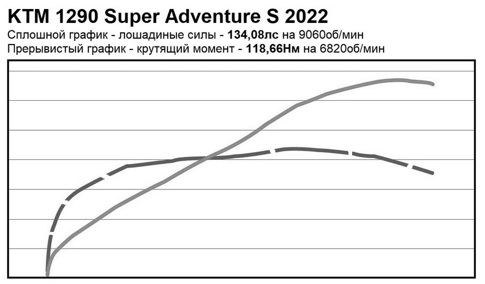 На динамометрическом стенде KTM 1290 Super Adventure S 2022 года, как и ожидалось, выдал значения, практически идентичные ранее измеренным характеристикам KTM Super Adventure R 2022 : 134,08лс на 9060об/мин и 118,66Нм на 6820об/мин. При этом огромное количество крутящего момента, более 95Нм, доступно чуть после 3200об/мин и до самой отсечки.