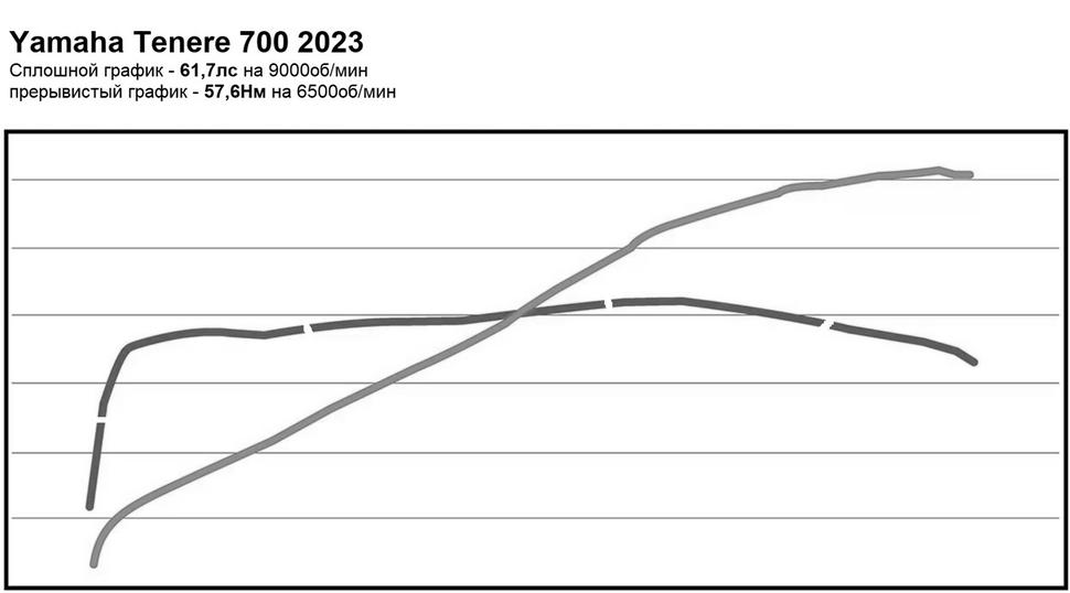 На диностенде Yamaha Tenere 700 2023 года показала пиковые 61,7лс на 9000об/мин и 57,6Нм тяги на 6500об/мин. Для сравнения, её прямой конкурент, Aprilia Tuareg 660 на том же диностенде показала 69,9лс/60Нм. Чрезвычайно ровная полка момента и линейная характеристика мощности делают Tenere 700 весёлым и одновременно чрезвычайно послушным мотоциклом, который превосходно ведёт себя на бездоре и вполне хорош на асфальте.