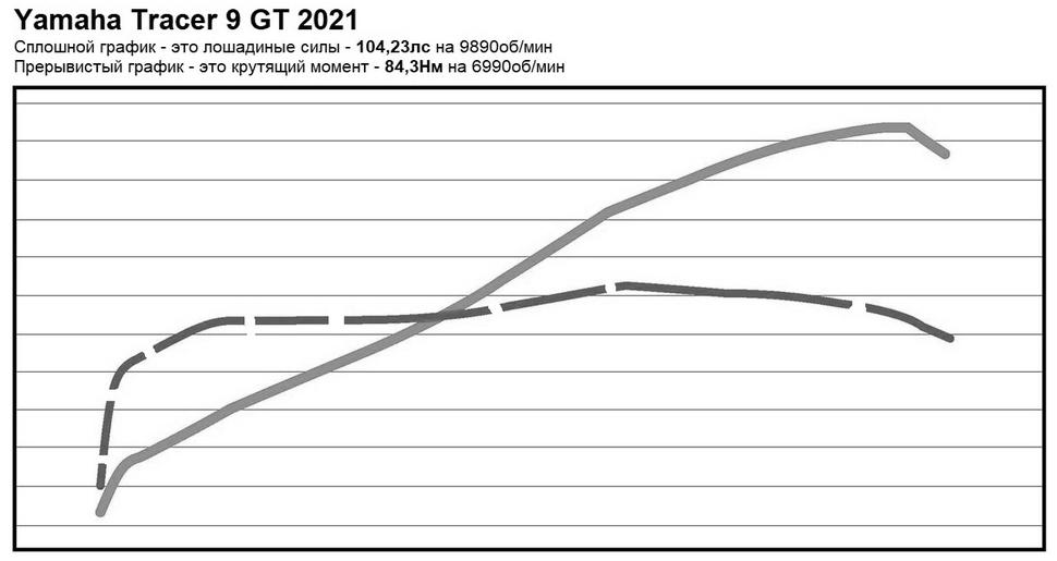 На диностенде новый Yamaha Tracer 9 GT 2021 показал пик в 104,23лс на 9890об/мин и 84,3Нм на 6990об/мин. Эти цифры очень близки к пиковым значениям производительности прошлой версии модели, Tracer 900 GT, который на том же диностенде выдал 104,9лс и 81Нм. Стоит подметить, что кривая мощности двигателя Tracer 2021 года начинает снижение чуть раньше и агрессивнее, когда переваливает за пик и приближается к несколько более ранней отсечке (10500об/мин против прошлых 11200).