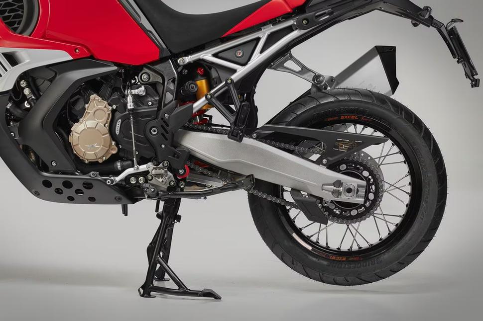 Основой шасси MV Agusta Enduro Veloce 2024 стала дуплексная стальная рама со съёмным стальным подрамником и алюминиевым маятником. Колёсная база длиной 161см почти такая же, как у Ducati DesertX (160,8см), но существенно больше, чем у новообретённого родича - KTM 890 Adventure R (153см). Угол вилки MV не сообщают, а трейл равен 11,7см (опять же, почти как у DesertX). Сухая масса в 224кг прилично (на 13кг) больше, чем у Ducati. Стоковое седло имеет два положения, и в нижнем высота по седлу достигает 85см, а в верхнем - 87см, при этом дорожный просвет равен 23см.