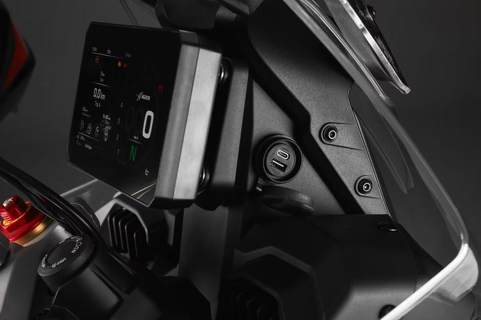 Полноцветный 7-дюймовый TFT-дисплей имеет как Bluetooth, так и Wi-Fi. Интерфейс настраивается весьма гибко - помимо возможности выбрать среди нескольких раскладок регулируется также яркость. Приложение MV Ride для смартфона обеспечивает запись маршрута и возможность поделиться им, а также пошаговую навигацию. Меню управляется при помощи кнопок на левом пульте, а оба пульта оснащены подсветкой для хорошей видимости в любое время суток. Вся светотехника Enduro Veloce - диодная, включая двойные фары головного света, оконтуренные белыми ходовыми огнями, компактные поворотники на ножках и затейливого вида задний фонарь. Среди других особенностей бортовой электроники стоит отметить бесключевой доступ и USB-розетку для зарядки гаджетов.