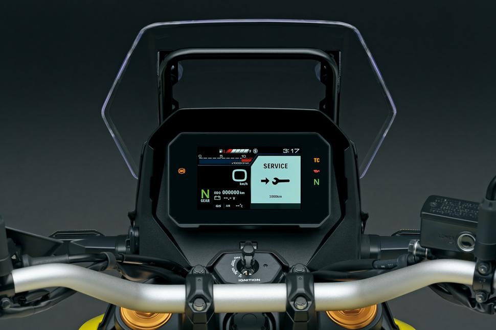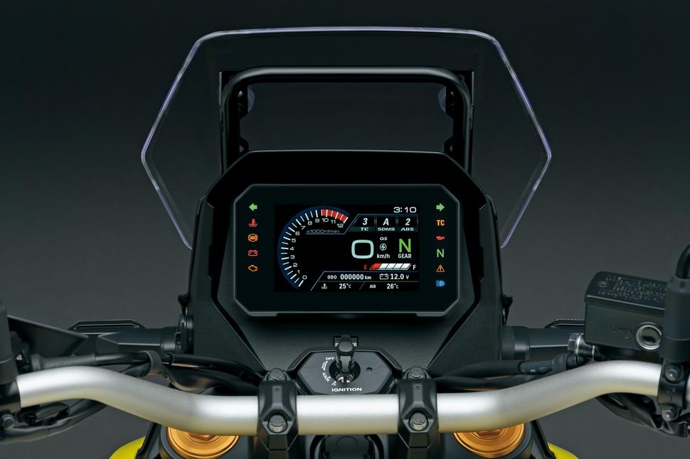 Электронный газ позволяет реализовать режимы езды, и Suzuki охотно воспользовались этой возможностью, реализовав целых четыре. Среди них особенно интересным является четвёртый, Гравийный. Он предназначен, как и подсказывает название, для гравийных дорог и ровных грунтовок. Также S.I.R.S. управляет двунаправленным квикшифтером, который, хочется надеяться, ничуть не хуже, чем на Suzuki GSX-S1000 GT+. Двигатель запускается коротким нажатием кнопки стартера - система Suzuki Easy Start позаботится о том, чтобы крутить стартером столько, сколько нужно для запуска, а если не получится завести мотор с первой попытки, то повторит через определённое время. И, наконец, система Suzuki Low RPM Assist (помощь на низких оборотах) автоматически добавляет газу при начале движения на холостых во избежание заглохания двигателя.