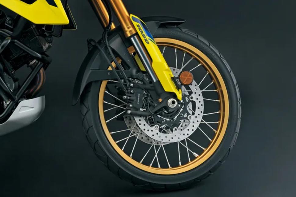 Заднее колесо на V-Strom 1050DE того же размера, что на XT - 150/70R17, но колёсный диск имеет другую конструкцию с более стильным креплением спиц к бортам обода. Сам обод по-прежнему имеет золотую окраску. Что удивительно, 21-е переднее колесо совершенно не соответствует заднему, у него спицы крепятся обычным образом, а это значит, что в него необходима камера, в то время как заднее скорее всего бескамерное. Также отличается и сам обод - у него куда более толстые борта, а спицы перекрещены по три на переднем колесе и по две - на заднем.