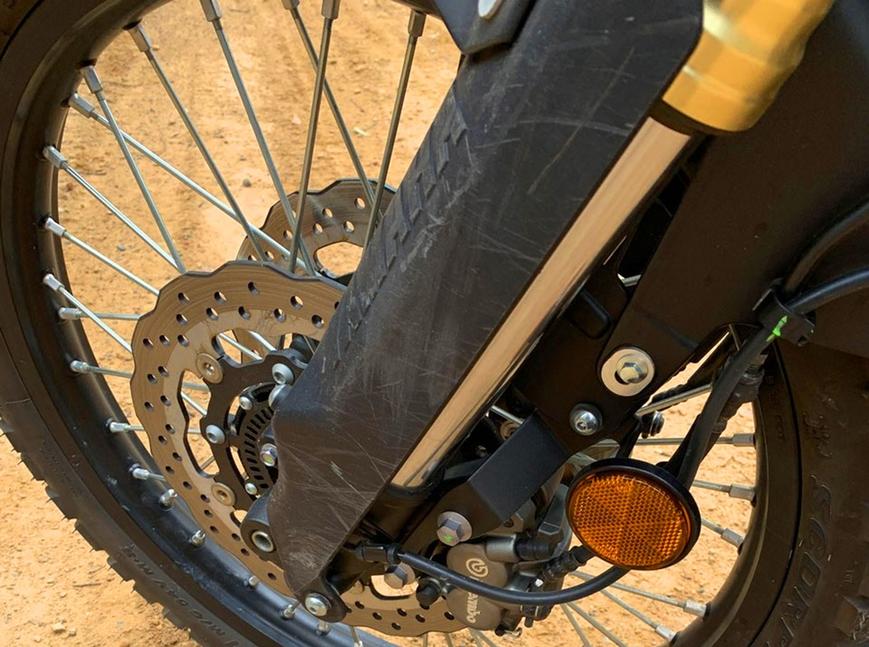 У Yamaha Tenere 700 тормозов просто достаточно, но выжимать их приходится сильно, и это порой пугает, когда уже почти оказался в повороте слишком быстро, и тормоза осаживают мотоцикл в последний момент. В итоге тоже приучаешься тормозить хорошо заранее. Они не слишком информативны и не слишком мощны - в общем, работают на пределе. Правда, при торможениях в повороте они далеко впереди 1200-ки.