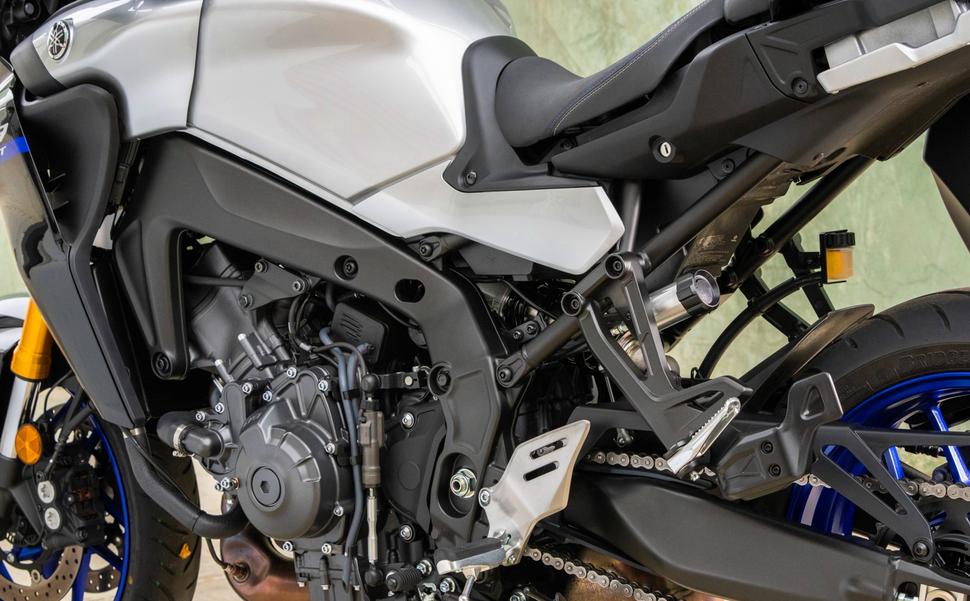 Новый Yamaha Tracer 9 GT основан на обновлённой платформе MT-09, как это было и раньше. Обе модели оснащены одним и тем же доработанным 890-кубовым мотором, у них обоих одинаковый выхлоп, рама с заниженной рулевой колонкой, обновлённые тормоза, облегчённые колёса, а проставки руля и крепления подножек регулируемые. Одно из двух важных отличий нового Tracer от MT - это маятник, который на 60мм длиннее. Он держит более мощный подрамник, благодаря которому увеличена грузоподъёмность мотоцикла для езды с пассажиром и багажом. Второе важное отличие - это подвески. На Tracer так же стоят компоненты KYB, но вместо ручных регулировок они оснащены электроникой, автоматически на ходу регулирующей сглаживание (сжатия и обоя вилки и только отбоя на заднем амортизаторе). Преднатяг пружин вилки настраивается ключом, а амортизатора - ручным регулятором.