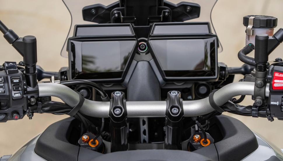 Ещё Yamaha Tracer 9 GT оснащён круиз-контролем и двумя режимами работы электронных подвесок. Оба режима автоматические, но в A1 настройки подбираются такими, чтоб подвески оставались спортивными и довольно жёсткими, а в режиме A2 сглаживание распускается для более мягкого хода. Полноцветных TFT-дисплеев на этом мотоцикле стоит аж два - видимо, дешевеют. Дисплеи размером 3,5 дюйма расположены в ряд и организованы довольно удобно - отображают много полезной информации и обеспечивают удобное управление.