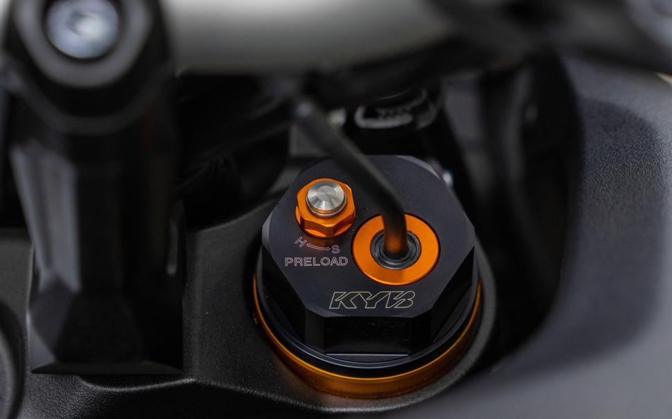 Дальше - подвески с электронной регулировкой, которая не впечатляет. Два варианта алгоритма автоподстройки не позволяют райдеру самому регулировать сглаживание ни в каком виде. Более мягкая настройка, A2, при езде в одиночку приятнее, но даже в этом положении сглаживание сжатия вилки слишком жёсткое. С пассажиркой зад оказывается слишком мягким, что едва компенсируется затягиванием преднатяга и переводом автоматики в режим A1, а это усилило жёсткость вилки, и что самое ужасное - появилось крайне неприятное козление на больших плавных лежачих полицейских - пассажирку аж из седла выкидывает. Слишком тугое сжатие в вилке, слишком резкий отбой сзади - и абсолютно ничего с этим не поделать.