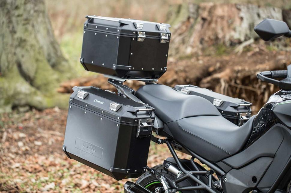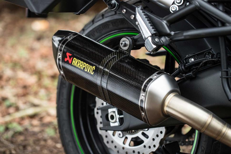 Kawasaki Versys 1000 Black Ops - это стандартный Versys, на который установлены боковые и центральный кофры Kappa, ручки с обогревом Oxford, дуги и защита картера SW Motech, настраиваемое ветровое стекло MRA, противотуманки, защита радиатора, наклейка на бак, карбоновый глушитель Akrapovic и резина Pirelli MT60 Corsa. Гарантия на мотоцикл не изменяется, вы также получаете стандартные покрышки. Всего будет создано только 20 байков Black Ops, так что серия эксклюзивна. Но так ли эти допы влияют на эксплуатацию байка?